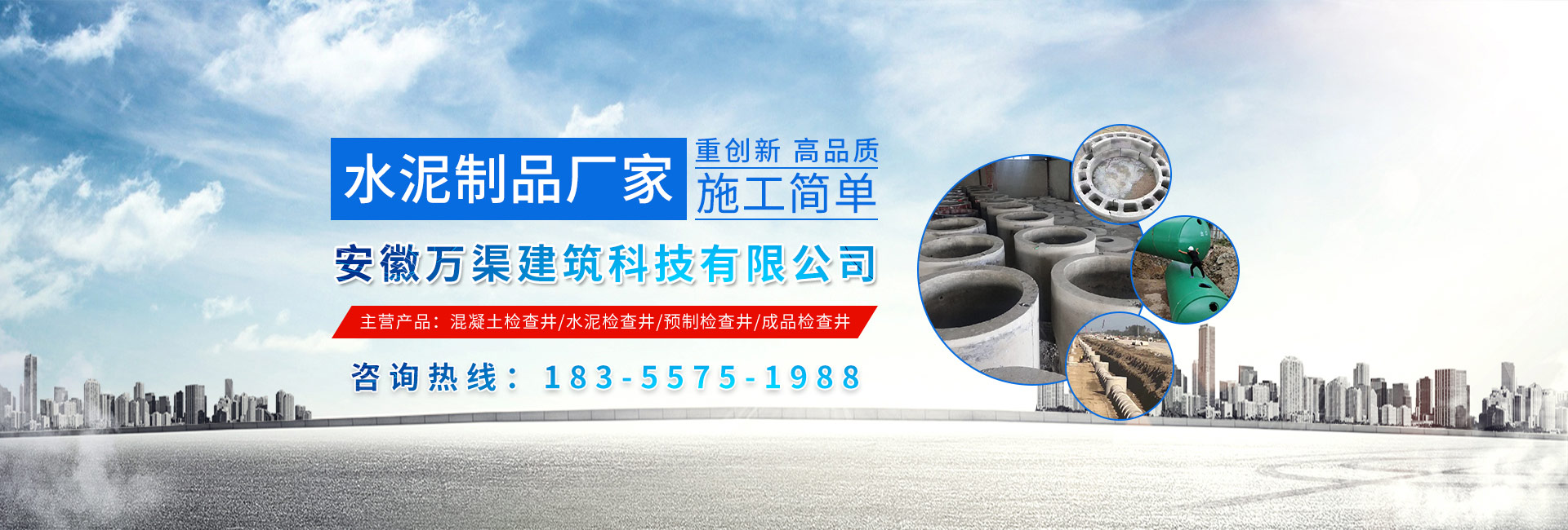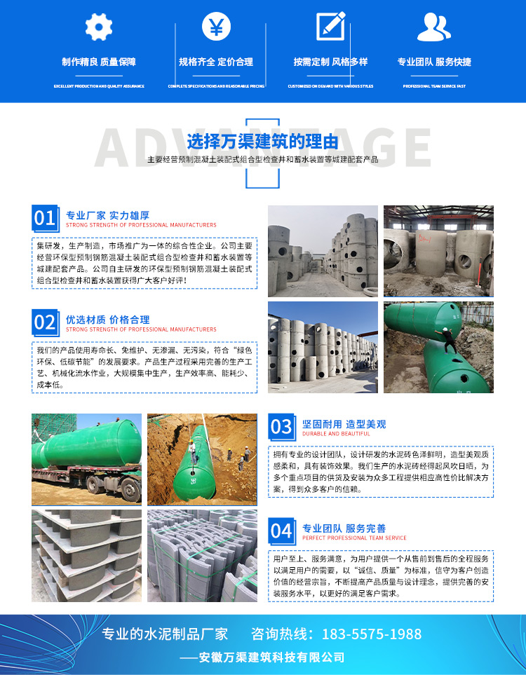 安徽萬渠建筑科技有限公司是集研發(fā),生產(chǎn)制造,市場推廣為一體的綜合性企業(yè)。公司主要經(jīng)營環(huán)保型預(yù)制鋼筋混凝土裝配式組合型檢查井和蓄水裝置等城建配套產(chǎn)品。產(chǎn)品生產(chǎn)過程采用獨特的生產(chǎn)工藝,機械化流水作業(yè)。產(chǎn)品大規(guī)模生產(chǎn),生產(chǎn)效率高,耗能少,成本低,產(chǎn)品使用壽命長、免維護(hù)、無滲漏、無污染,符合“綠色環(huán)保,低碳節(jié)能”的發(fā)展要求,是傳統(tǒng)磚砌井池的理想替代產(chǎn)品。